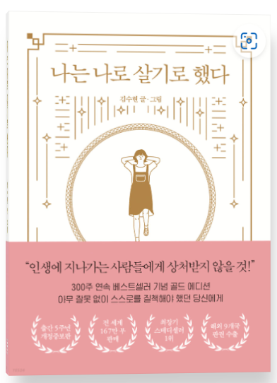 [나는 나로 살기로 했다] 책은 최장기 스테디셀러 1위. 빅데이터로 증명된 '나로 살기'열풍을 이끌며 시대정신을 만든 책. 2016년 출간 이후 국내에서만 100만 부 이상 판매되며 전국 서점 260주 연속 베스트셀러에 오른 책. 일본에서 가장 많이 팔린 한국 책이자 전 세계에서 사랑받는 K-에세이의 대표작. N차 독서를 하고 인생 책으로 꼽는 책.