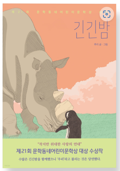[긴긴밤]이라는 세 글자 제목이 어떤 내용일까 궁금했는데 다 읽고 보니 이 제목 안에 등장인물들의 고통과 용기, 협동과 우정 등이 모두 함축되어 있는 것 같다. 더불어 '동물의 권리'를 알고 '동물을 존중'해 줘야 함을 알려주는 그 어떤 책 보다 강한 가르침을 주는 도서. '생명'의 소중함에 대한 생각을 자연스럽게 할 수 있는 도서.